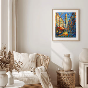 Bring the charm of the Mediterranean into your home with this reproduction of my original acrylic painting on canvas. Inspired by the colorful streets of Alicante, Spain, this artwork reflects the warmth of the seaside atmosphere and expressive brushstrokes in an impressionist–expressionist style.
