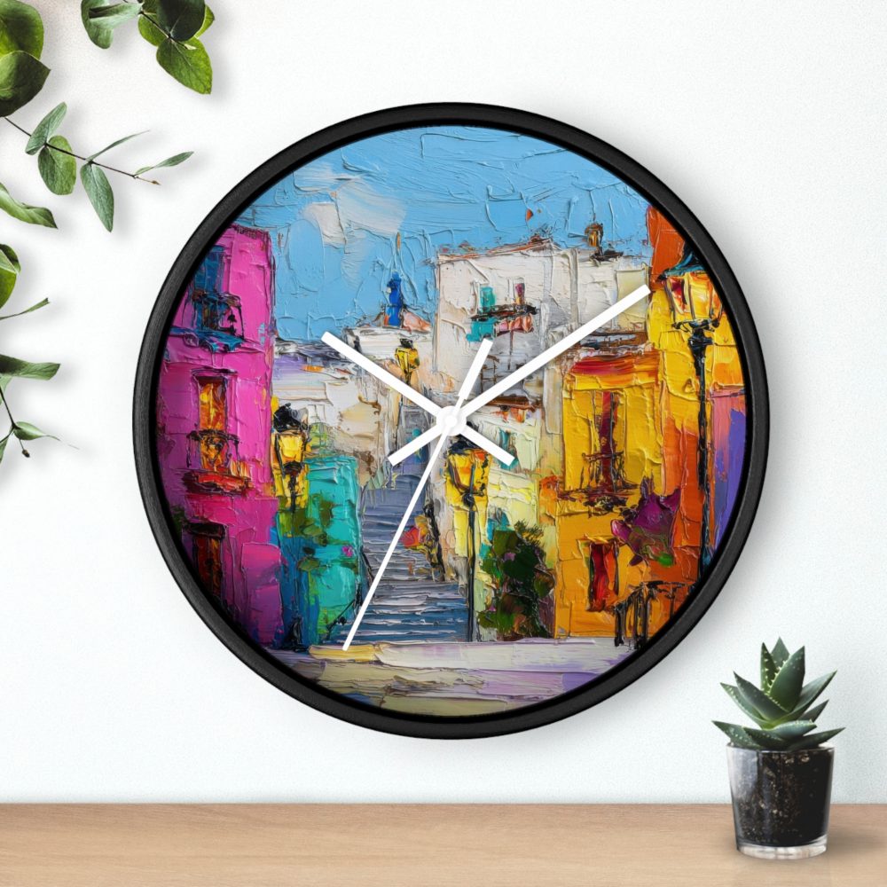 Bright, painterly streets climb toward a sky-blue horizon on this wooden wall clock. Each brushstroke feels alive — magenta facades, sunlit ochres, and splashes of turquoise converge into a lively alley that marks the hours. The silent mechanism keeps time without ticking, while a slim plexiglass face and clean frame let the artwork take center stage. Hang it where mornings begin or evenings unwind; it turns routine moments into a small, colorful escape that reminds you of wandering through sunlit neighborhoods and lingering at café corners.