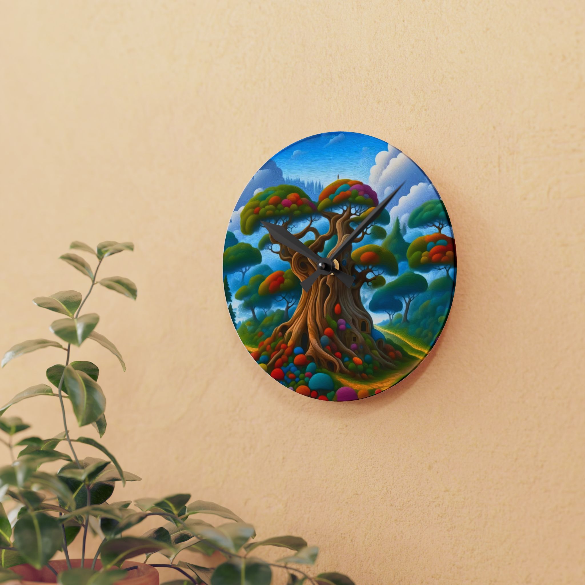 Bring a splash of wonder to your wall with this vibrant acrylic clock. The glossy face showcases a whimsical, colorful tree scene that feels like a window into a gentle fantasy — bright skies, rounded foliage, and playful color clusters that catch the eye. Lightweight but sturdy, the clear acrylic keeps colors vivid and the print sharp. Hang it in a reading nook, nursery, or creative studio to slow the pace and invite a calm, imaginative moment every hour. The silent movement and simple black hands keep time without stealing attention from the artwork, while a built-in keyhole slot makes mounting quick and neat.